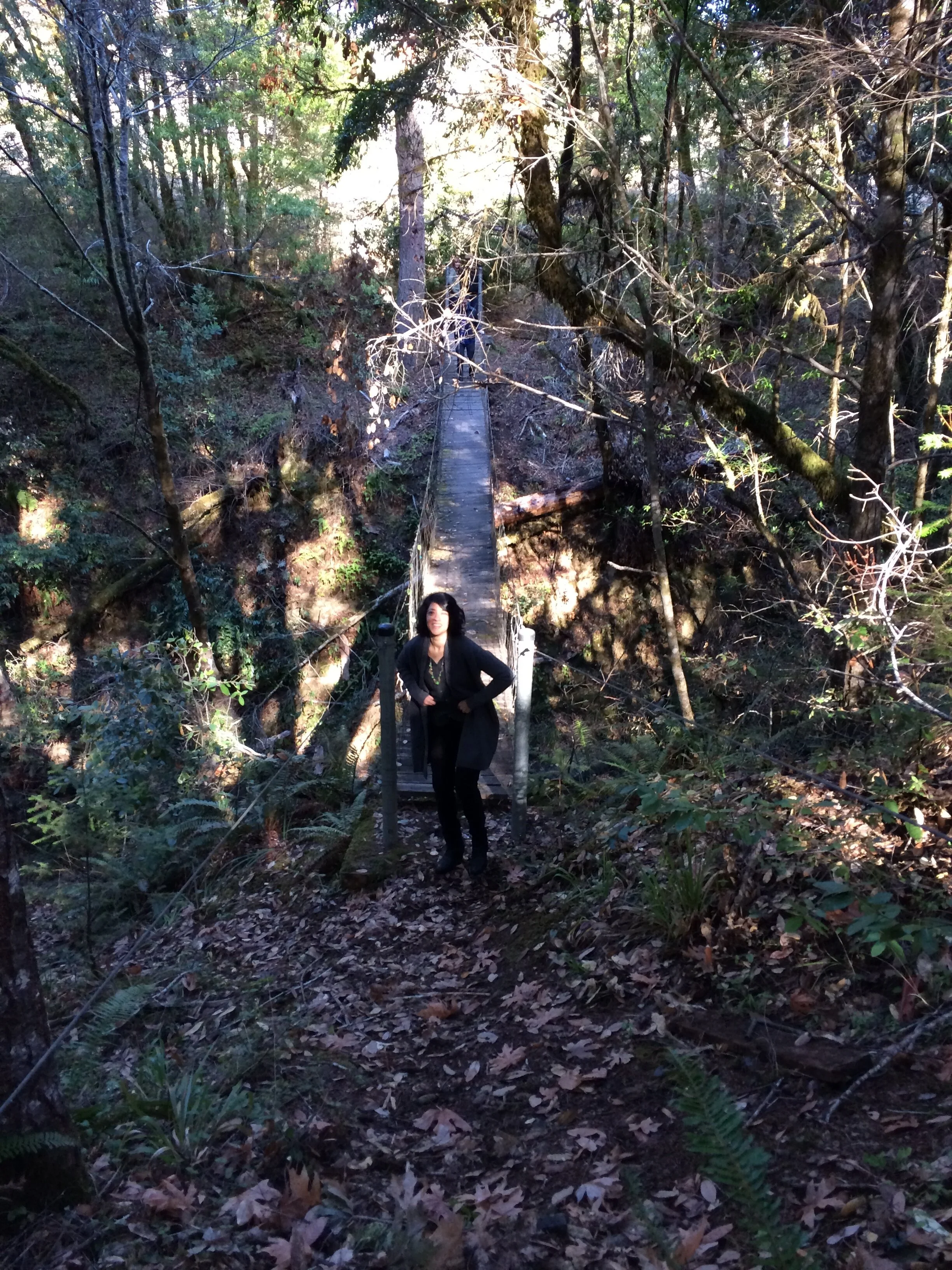 Anu on a rope suspension bridge over a creek on the property, Dec. 28, 2013